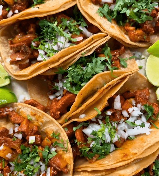 Fresh corn tortillas stacked with your choice of protein, topped with cilantro, onion, and house-made salsa — simple, bold, and done right.
